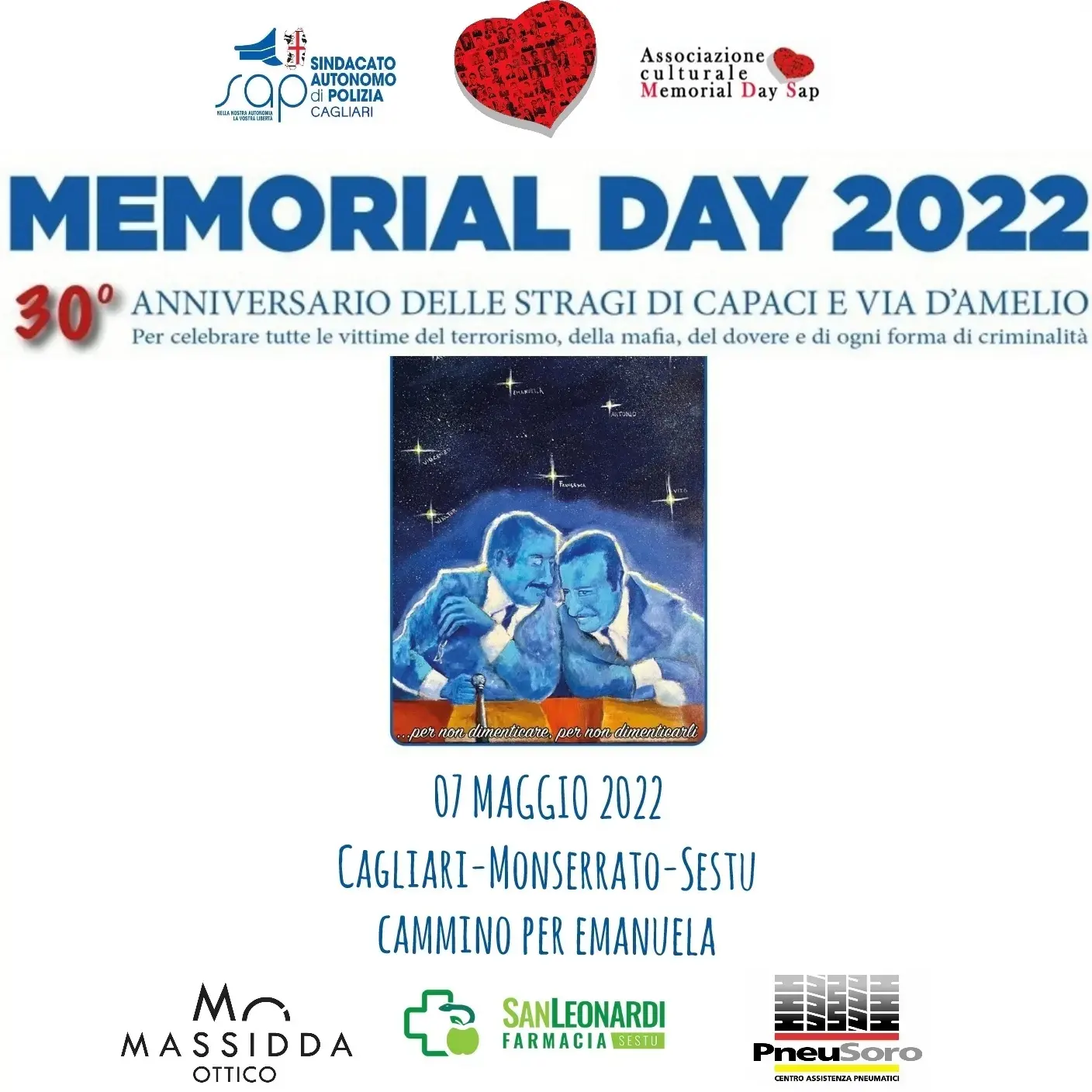 Nell’ambito delle iniziative legate al Memorial Day Sap, in occasione del trentesimo anniversario delle Stragi di Mafia di Palermo, la Segreteria provinciale di Cagliari ha organizzato per il giorno 07 maggio 2022 un evento denominato “Cammino per Emanuela” per ricordare la nostra collega Emanuela Loi caduta nella strage di via D’Amelio a Palermo. L’occasione sarà ideale per ricordare e onorare lei e tutti i nostri caduti. Il programma si concentrerà su una camminata sportiva non competitiva di una decina di atleti che partirà dalla questura di Cagliari per arrivare al Cimitero di Sestu, passando per il ponte Emanuela Loi e per il murale a lei dedicato in Piazza della legalità nel centro del Comune di Sestu. Il percorso, di circa 18 km, si completerà in circa tre ore escluse le soste. Questo il programma: