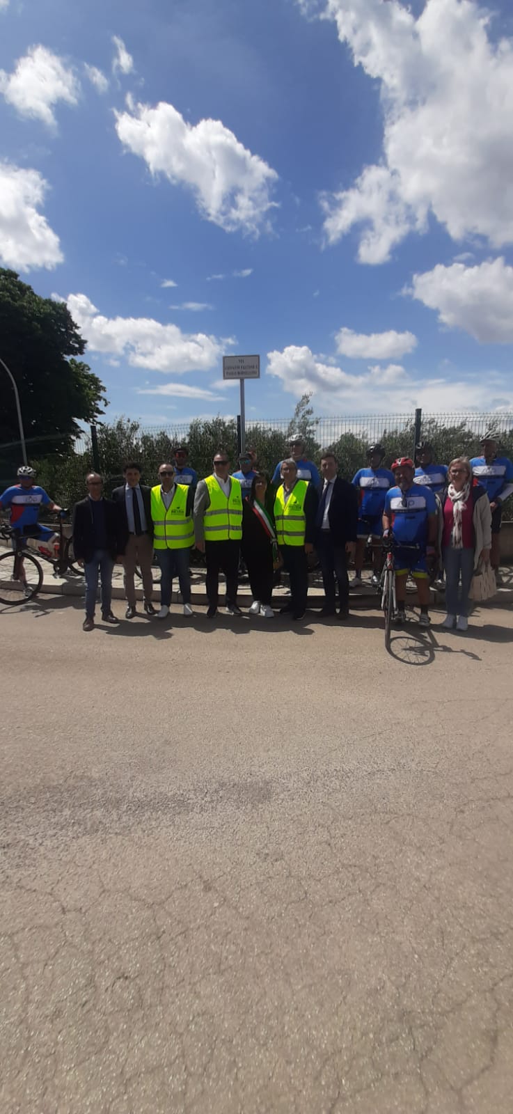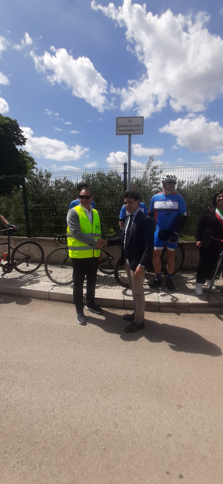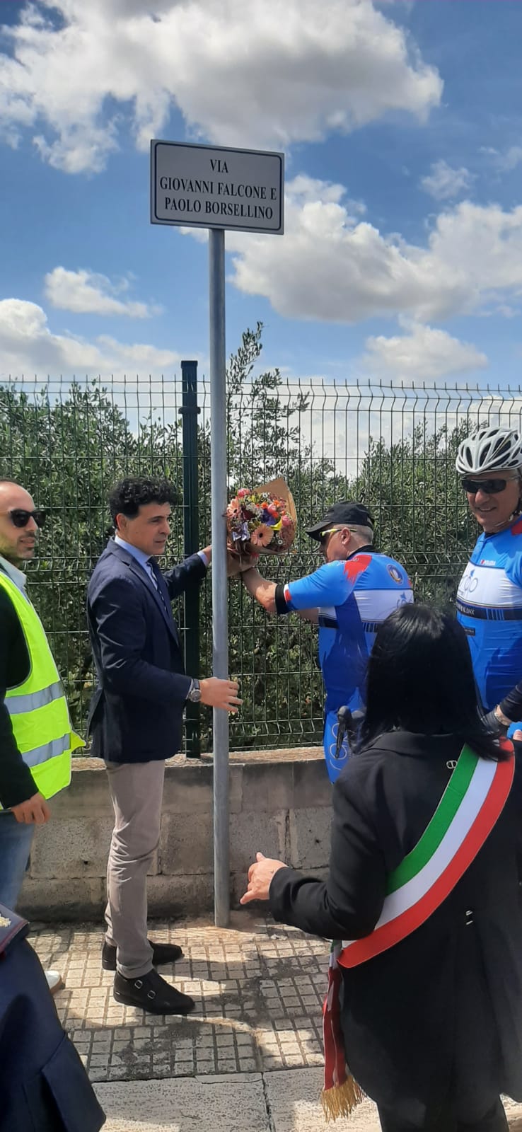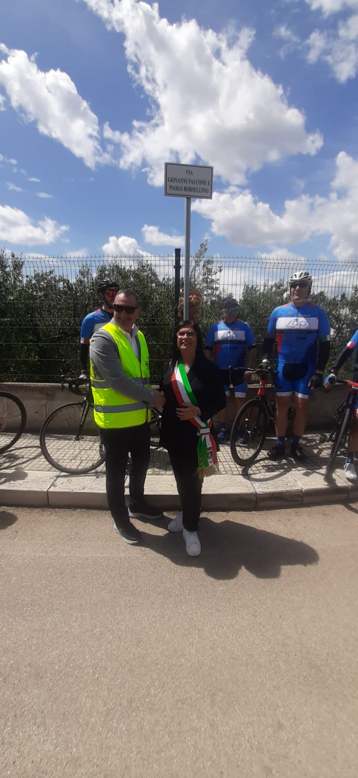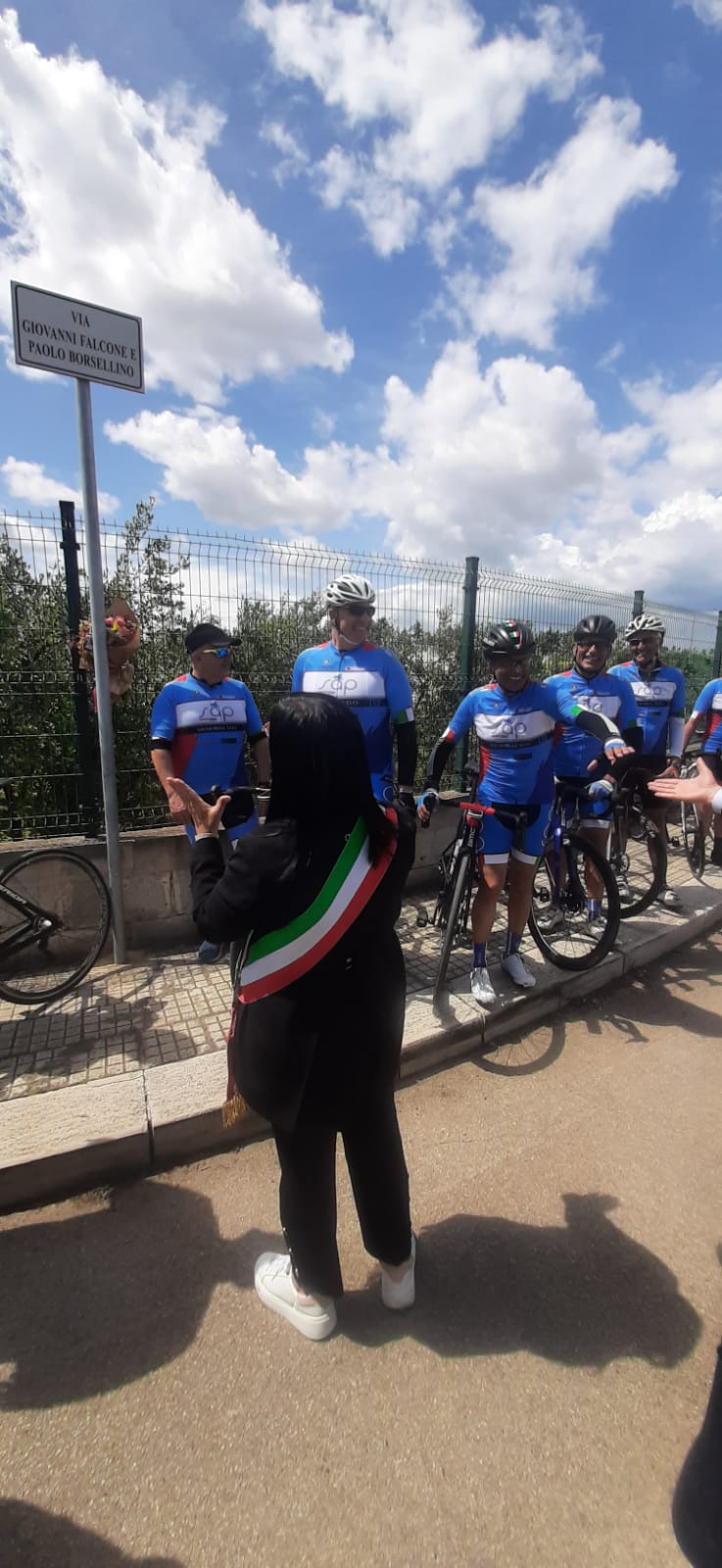 A seguire, la carovana ciclistica, si è diretta verso il Comune di San Vito dei Normanni ove, in presenza del Sindaco Prof.ssa Silvana Errico, del Presidente del Consiglio Comunale Avv. Alberto Magli, dell’Assessore Alessandra Pennella, del Consigliere comunale Dr. Luciano Cavaliere e del Dirigente del Commissariato di P.S. di Mesagne, ha deposto un omaggio floreale in prossimità della tabella indicativa della nuova strada urbana dedicata ai Giudici Falcone e Borsellino, vittime di mafia.